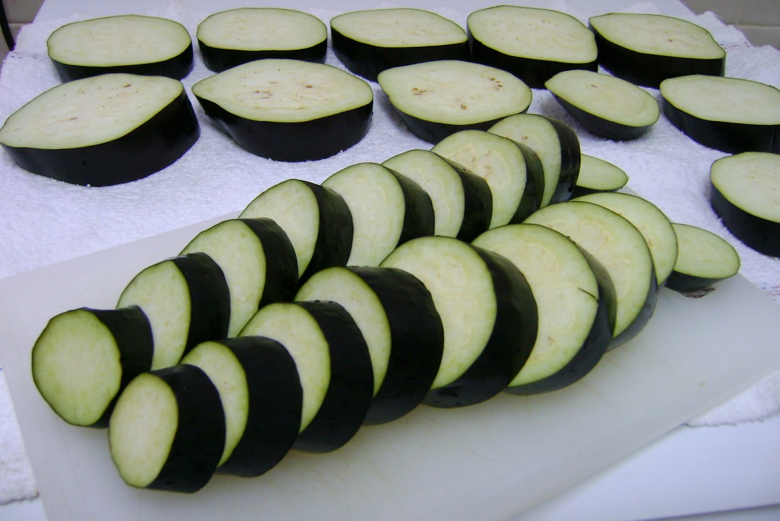 - Slice two eggplants as you like. Lay them out and salt them generously. I usually do this whenever I have time in the afternoon.